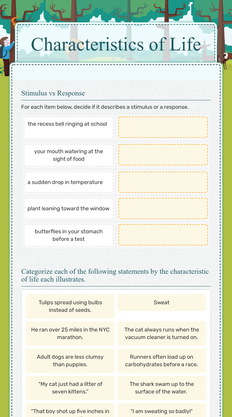 Characteristics of life worksheet ID: 1173036 Language: English School subject: Science Grade/level: Grade 7 Age: 10-13 Main content: Characteristics of life Other contents: organisms Add to my workbooks (15) Download file pdf Embed in my website or blog Add to Google Classroom