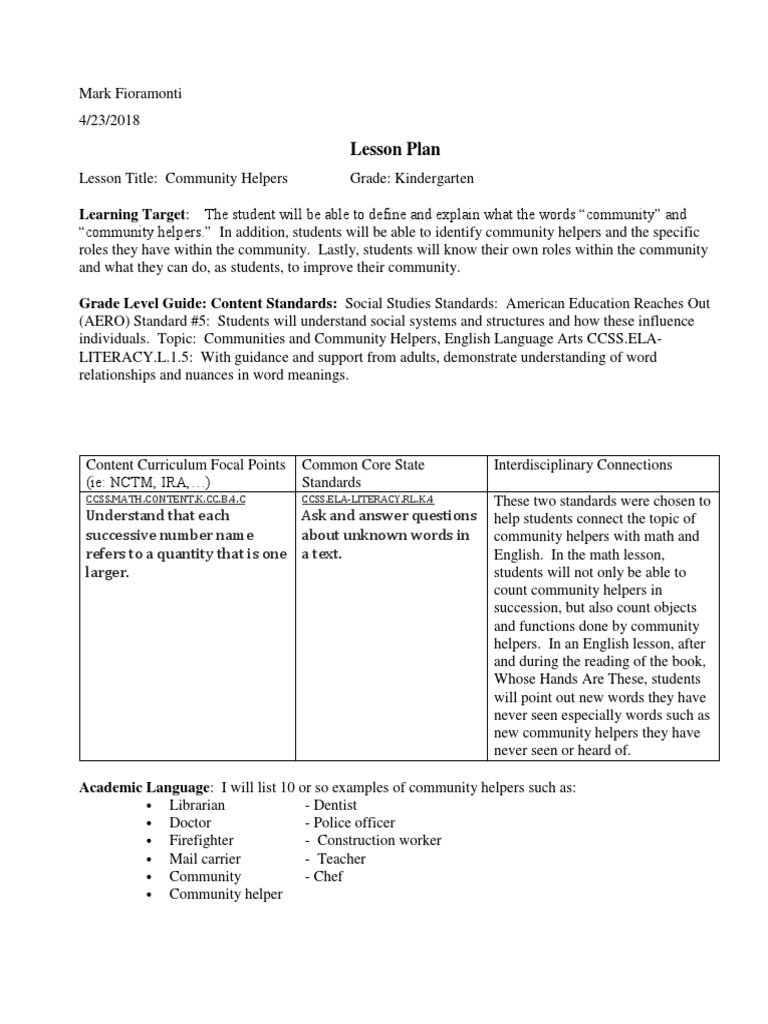 Community Helpers - Teacher-Created Lesson Plan | Common ... Teacher-Created Lesson Plan Community Helpers This is an introduction to community helpers, after learning about what a community is. (Used with a Special Education class) Ivy L. Special education instructor P.S. 130 Abram Stevens Hewitt Bronx, United States Objectives