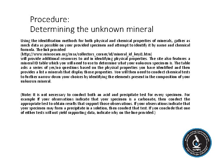 Automated Indicator Mineral Identification Methods for The ... AUTOMATED INDICATOR MINERAL IDENTIFICATION METHODS FOR THE CRITICAL MINERAL EXPLORATION (INDIKA) | There is an increasing interest in EU and Fennoscandia for exploration of so-called critical ... Chrominfo: Identification test of calcium gluconate Procedure for identification of calcium gluconate: Test 1: Add 00.05 ml of the ferric chloride test solution to 01.00 ml of a 03 % w/v solution, which produces a yellow color. Test 2: Add 01.00 ml acetic acid to 05.00 ml 2.0 % w/v solution. The solution stays clear after adding 00.50 ml potassium ferrocyanide solution. Mineral Identification Gizmo Answers → Waltery Learning ... Massis the amount of substance in an object. In the mineral identification gizmo™, under choose property to test, select density. Minerals among us venture outside on any particular day, look down along the traversed path and select a rock, any rock, call it [note: Massis the amount of substance in an object.