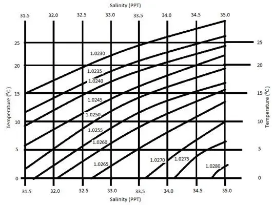 PDF Effect of Temperature on Density remember temperature-density relationship for seawater temperature of maximum density is right at freezing point (~ -1.91oC). smaller temperature range than SST. <1oC - 2.5oC @ 4000 m depth overall, from ~1000 m and below, most temperatures are 2o - 4oC.
