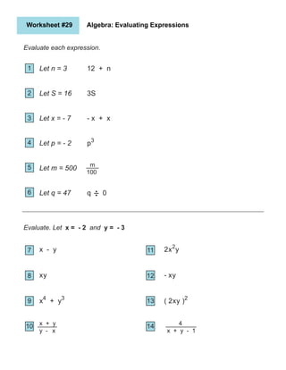 Evaluating Algebraic Expressions (Worksheets) Evaluate each expression; Substitute numbers for variables to solve. The basic level expressions do not include parenthesis or exponents. On this worksheet, each expression has only one variable.