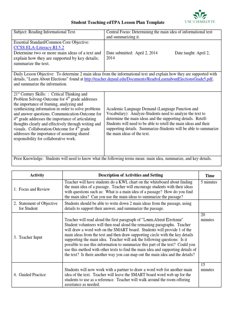 27+ Lesson Plan Examples for Effective Teaching... - Venngage Lesson planning is crucial for helping your students reach their learning objectives. We've pulled togethe the best lesson plan example for every subject. Lesson plans are the best way to deliver an effective and engaging lesson. Lesson plans also help keep you on track to ensure that your... Identifying main ideas and supporting details The main idea may be directly stated, or it may be implied (meaning you have to *Note-You are most likely to be asked about details that support the main idea. Keep in mind, if the answer choice Make use of the information within the text. (ex. The plan was disclosed to a number of people, but they did... PDF IXL Language Arts | Main Idea and Supporting Details Lesson Plan Optional: Determining the Main Idea Task Cards (Create enough sets for partner use.) Main Idea and Supporting Details Lesson Plan. 2. Tell students that today they are going to explore the concept of a main idea and how understanding the main idea of a text helps readers more clearly comprehend...