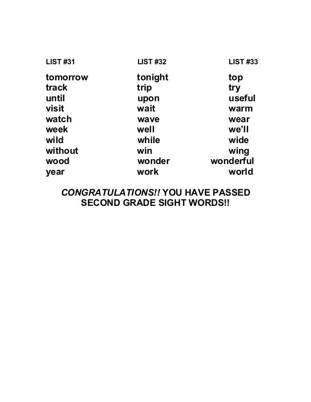 Dolch Sight Words Second Grade (46 words) always around because been before best both buy call cold does don't fast first five found gave goes green its made many off or pull read right sing sit sleep tell their these those upon us use very wash which why wish work would write your. Created Date: Second Grade Sight Word List. 2nd set of 100 sight words for 2nd graders Color and B&W included... Danielle Marshall. Second Grade Ideas. 3rd Grade Spelling. ... Instruction: This is a grade 4 sight words list, can be used as a good checklist for both students and teachers. noha al hussain. grammar for grade 4. 2nd Grade Ela. 2nd Grade Writing. In this second grade dolch list sight words video, learn the second grade sight words one by one as they are rehearsed ... 2nd grade Dolch sight words When young readers memorize sight words, they advance in confidence and fluency. Here are the 40 sight words that will improve your second grader's reading skills. by: GreatSchools Staff | October 21, 2013 Print article 2nd grade Dolch sight words