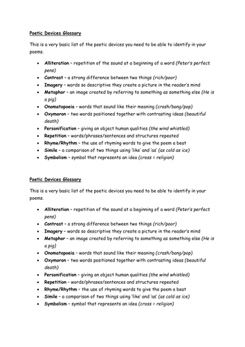 Elements of Poetry Worksheet - Sound Devices | Teach Starter A worksheet to help students understand sound devices in poetry. Understand, interpret and experiment with sound devices and imagery, including simile, metaphor and personification, in narratives, shape poetry, songs, anthems and odesElaborationsdiscussing how figurative language...