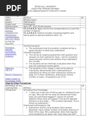 The plan is designed for kindergarten students. It requires three class periods of 30 to 45 minutes each . Objective The objective of this lesson is for students to represent addition and subtraction with objects and actions to understand the concepts of adding to and taking from. The teacher will be modeling the subtraction game at the end of the lesson. Transition Transition the students by calling each colored table up to pick their connecting cubes. Guiding the Practice The teacher will guide the lesson by using the elmo to show them what they are doing next. Teacher will walk around to guide the students in their There are many words used to describe subtraction: The plan is designed for kindergarten students. 12.08.2019 · in this sample lesson plan, students represent addition and subtraction with objects and actions. Reading comprehension, story comparisons, retelling, math and literacy connections, and a fun fine motor activity! Tell your class they are going to be learning a lot more about subtraction in the coming days. Go over Basic Subtraction Word Wall words and their definitions, including the minus sign. Tell students to keep an eye out for these words in the movie they are about to watch. Show the BrainPOP Jr. movie Basic Subtraction.