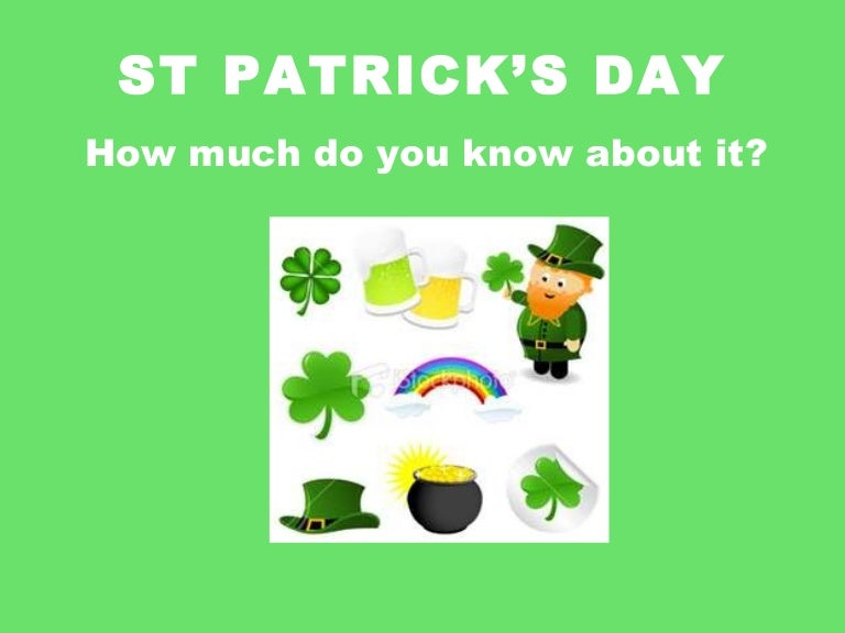 35+ St Patrick's Day Quiz Questions and Answers - Quiz ... Round 1: Easy St Patrick's Day Trivia questions and answers When is St Patrick's Day? 17th of March Which country is St. Patrick the patron of? Ireland Which colour symbolises St Patrick's Day? Green Which plant is the symbol of Ireland? Shamrock In which modern country was St Patrick born? Wales What is the traditional food for St Patrick's Day?