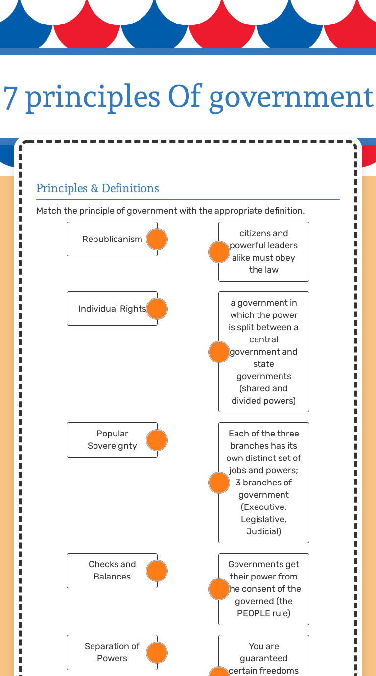seven principles of government worksheet Flashcards | Quizlet seven principles of government worksheet STUDY Flashcards Learn Write Spell Test PLAY Match Gravity Created by sarah_sierra Terms in this set (19) the power to govern comes from the people popular sovereignty the people elect representatives to make laws and conduct government republicanism congress makes laws for the nation separation of power