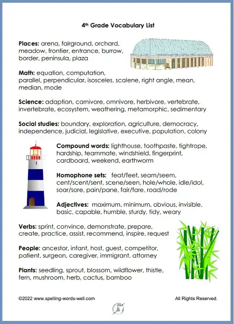 4th Grade Vocabulary List - Spelling Words Well Plants: seedling, sprout, blossom, wildflower, thistle, fern, mushroom, herb, cactus, bamboo Extension Activities Choose from these extension activities to give your child/students extra practice using words from the 4th grade vocabulary list. Add more activities of your own. 1) Find two pairs of adjectives on the list with opposite meanings.