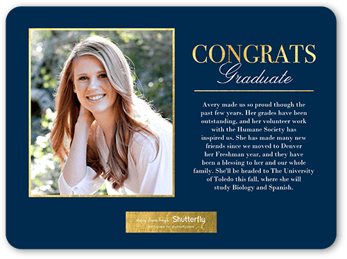 What to write on graduation announcements. Graduation Announcement Wording Tips & Ideas | The Studio Style Blog A sample of a formal graduation announcement text: Mr. & Mrs. Paul Monahan Announce the graduation of their daughter Katherine Anne Monahan from East High School On Saturday June 15th, 2019 Story Announcements Sometimes graduates want to share more than just their name, school, and class year. What do you write on a high school graduation announcement? Do you write anything in graduation announcements? Write the name of the addressee and family on the front of the inside envelope; their names may be expressed informally. Place your graduation announcement into the inside envelope with the folded edge inserted first and the front of the announcement facing the flap. A Complete Guide to College Graduation Announcements - ThoughtCo Traditionally, a college graduation announcement uses formal language such as "The President, Faculty, and Graduating Class..." in the opening lines before giving the details in equally formal terms. Spelling out dates and avoiding abbreviations for degrees are just some of the features of formal announcements. Casual and Informal Announcements What do you write on a 2020 graduation announcement? More formal. Congratulations on your well-deserved success. Warmest congratulations on your graduation. Congratulations on your graduation and best wishes for your next adventure! So happy to share in the excitement of your graduation day, and so very proud of you, too! With love and pride today and always,