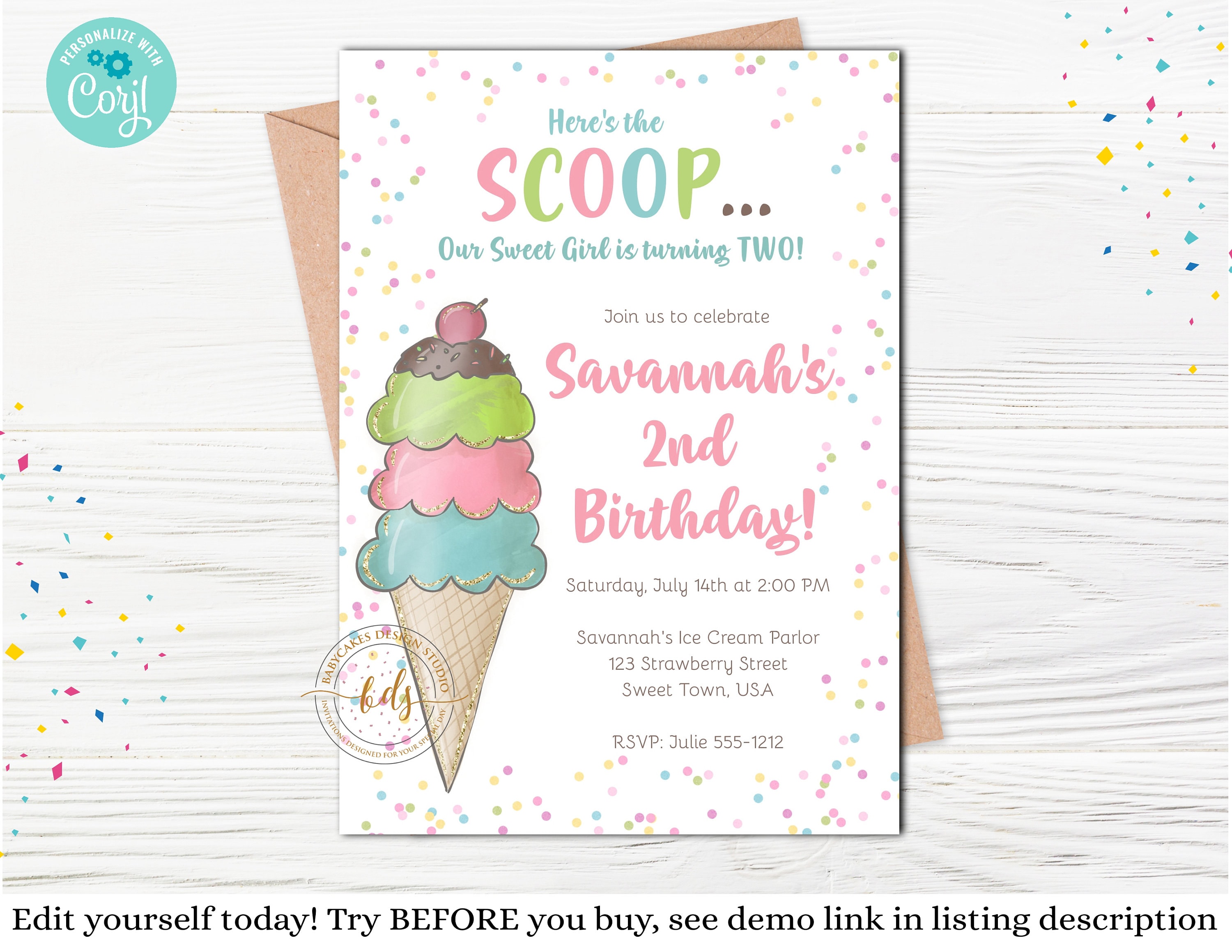 Ice Cream Birthday Invitations - First Birthday Invite - Girl Ice Cream Social Invitation - Two Scoops - Here's The Scoop