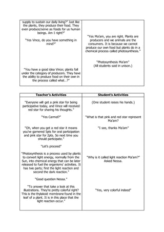 Photosynthesis Lesson Plan.pdf - Lesson plan template:... View Essay - Photosynthesis Lesson Plan.pdf from EDUCATION EDUC4132 at Witwatersrand. Lesson plan template: LESSON PLAN Date: 17/09/2020 Grade: 11 Lesson plan number: 2 of 3 Topic: Photosynthesis - ... LESSON PLAN SAMPLE Name of the school: Subject: Summary of activities: Homework: 1.1 Study the sample of the lesson plan above. Is this lesson