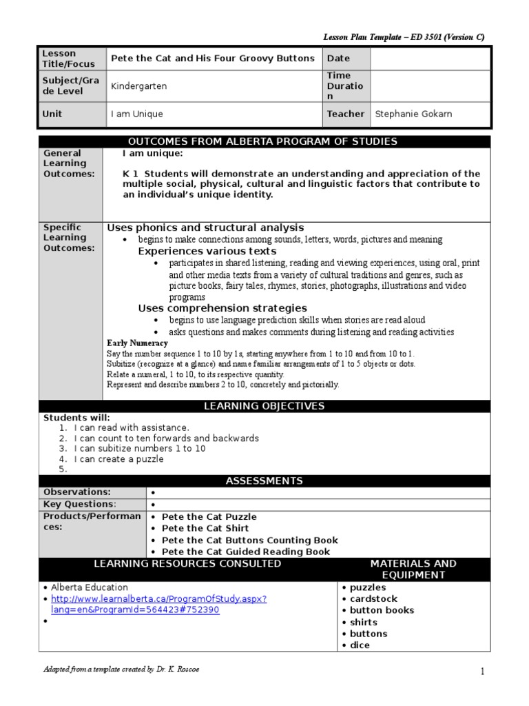 Pete The Cat Four Groovy Buttons Lesson | PDF | Cognitive ...