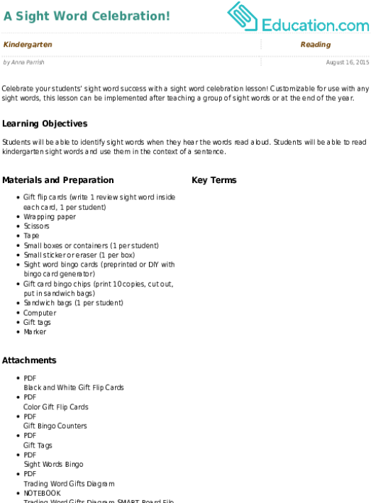 Kindergarten Sight Word Lesson Plans & Games | Gynzy These kindergarten sight word lesson plans cover sight words that mostly fall within the Kindergarten-level Dolch sight word list: Fry sight words - am, is, are Fry sight words: day, may, called Fry sight words: find, more, sit Fry sight words: number, people, many Fry sight words: would, long, water Dolch sight words - all, get, did Sight Word Lesson Plan Teaching Resources - TPT Results 1 - 24 of 4000+ ... This lesson plan includes 17 weeks worth of sight words, including flash cards for students and flash cards to be used in the classroom. Fun with Sight Words | Lesson Plan | Education.com This lesson can be used as a pre-lesson for the Sight Word Bingo lesson plan. Objectives Academic Students will practice reading and spelling grade-level sight words. Language Students will be able to read and use high frequency words using written supports. Introduction (2 minutes) Sight Words Lesson Plans & Worksheets Beginning readers pick a sight word card, choose the number of toilet paper rolls that corresponds with the number of letters in the word, and then spell the ...