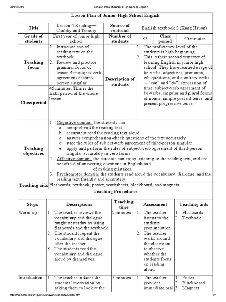 ESL Lesson Plans for High School: 4 Ideas for Teaching Teens English ... 4 Inspiring ESL Lesson Plans for High School Students 1. ESL Vision Board The ESL Vision Board is an activity that combines creativity with communication. Your ESL high school students will gather their favorite magazine clippings and words relating to their English future. High School Sample Lessons - K12 Choose an Academic Sample Lesson. K12's high school program is designed to help students find their own path. A combination of core courses and electives allows students to pursue their passions and follows them to post-high school success, whether in college or the workforce. High School English Lesson Plan Template Create a Lesson Plan suitable for English teachers in High School with the help of Template.net. Our Free Editable High School English Lesson Plan Template is designed by professionals to provide an outline for you to create an effective Lesson Plan for English Classes in High School. Use our Document Editor Tool for free and download it in ... 27+ Easy-to-Edit Lesson Plan Examples [+ Writing Tips] - Venngage The English lesson plan example below measures out timings for each activity so you finish perfectly on time. You can use a timer on your interactive whiteboard, or get students to time themselves. Scheduling is a great skill to incorporate into any lesson plan. [source] 7. Think outside the box when lesson planning